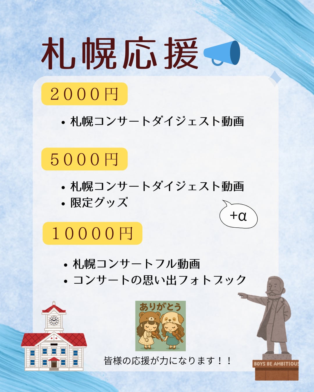 いただいたご支援は今後の更なる活動に向けて、コンサート開催費用や遠征代、CD・グッズ作成代など大切に活用させていただきます。